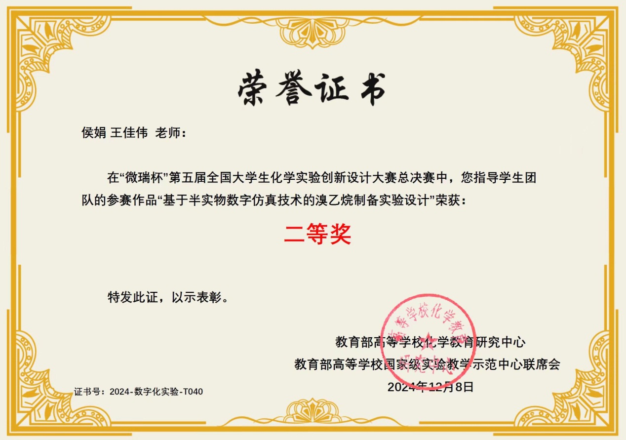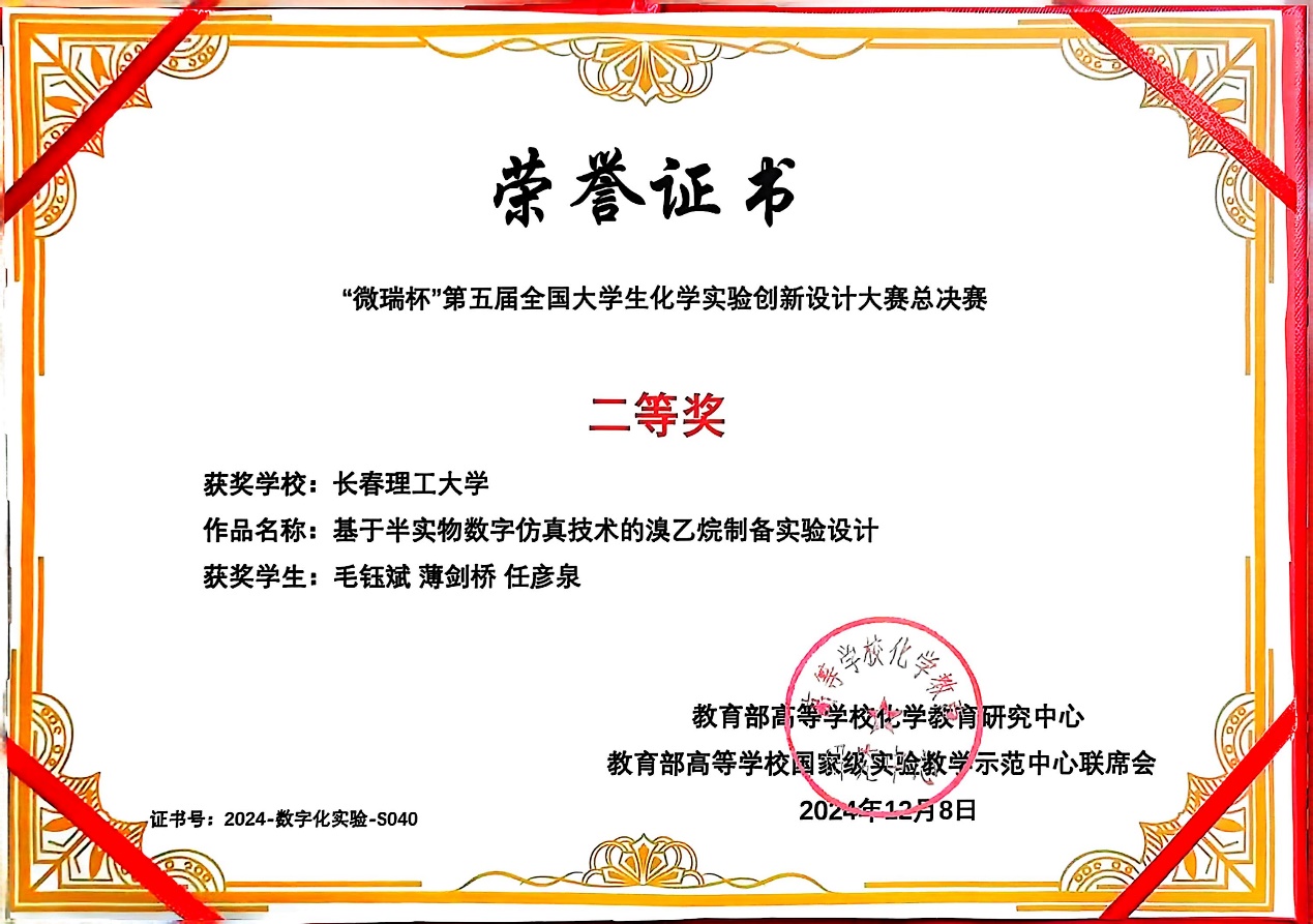 近日,由中国化学会,教育部高等学校国家级实验教学示范中心联席会主办的“微瑞杯”第五届全国大学生化学实验创新设计大赛总决赛圆满落幕。我院大四学生毛钰斌带领的长春理工大学数字化实验队(指导老师:侯娟,王佳伟)凭借出色的表现,赴沈阳师范大学参加决赛,并首次代表长春理工大学斩获全国二等奖。